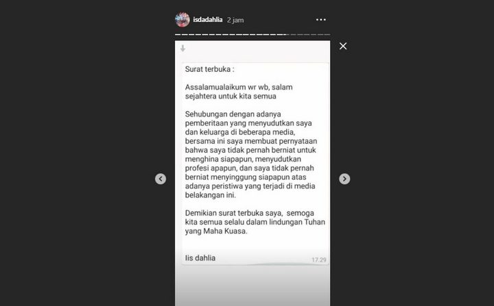 "Surat Terbuka. Assalamualaikum WR WB, salam sejahtera untuk kita semua. Sehubungan dengan adanya pemberitaan yang menyudutkan saya dan keluarga di beberapa media, bersama ini saya membuat pernyataan bahwa saya tidak pernah berniat menyudutkan profesi apapun, dan saya tidak pernah berniat menyinggung siapapun atas adanya peristiwa yang terjadi di media belakangan ini," tulis Iis Dahlia.